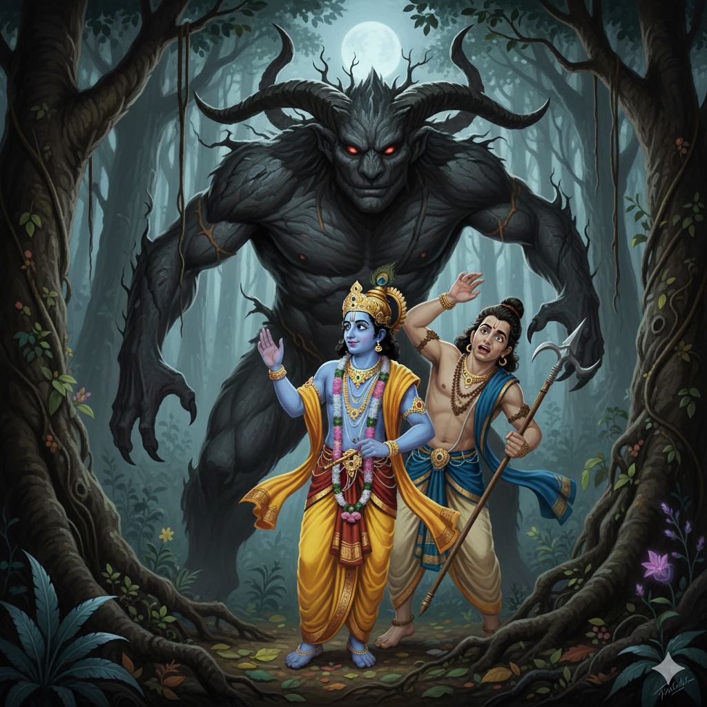 Krishna looked at the demon, closed his eyes for a moment, and then opened them. To everyone’s surprise, Krishna appeared as a giant — far bigger and more powerful than the demon!