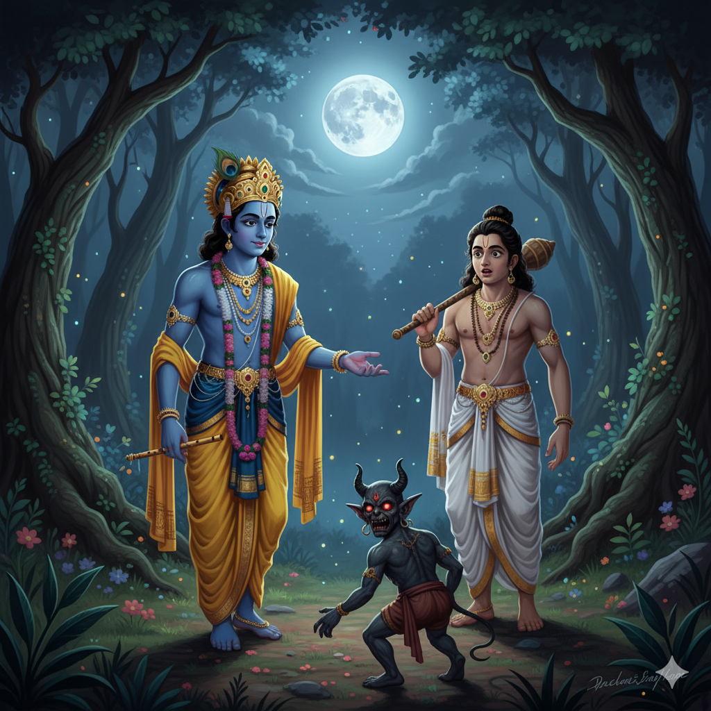 “One fine day in Dwaraka,” began the teacher, “Krishna and his elder brother Balarama decided to go for a walk in the nearby forest. The sun was shining, birds were singing, and both brothers were happily chatting.”